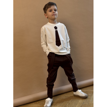 Elegancki, a jednocześnie super wygodny komplet świąteczny dla chłopca. Koszulka z nadrukiem krawata + spodnie z dresówki ze stylowymi szelkami i wysokim ściągaczem.